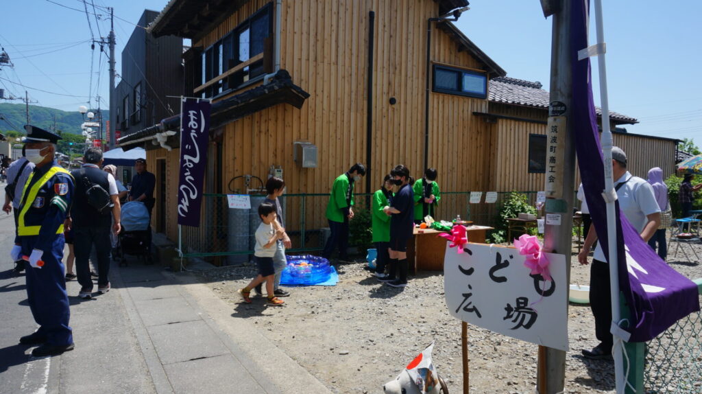子ども広場にみんなあつまれ。ヨーヨー釣りやおもちゃ作りが待ってるよ。