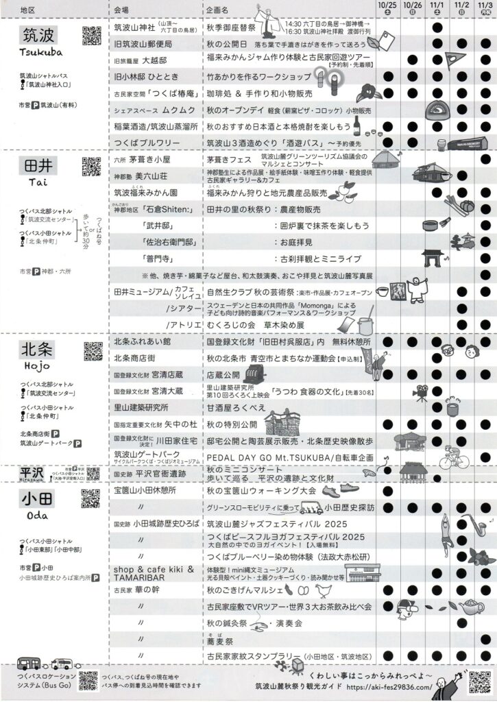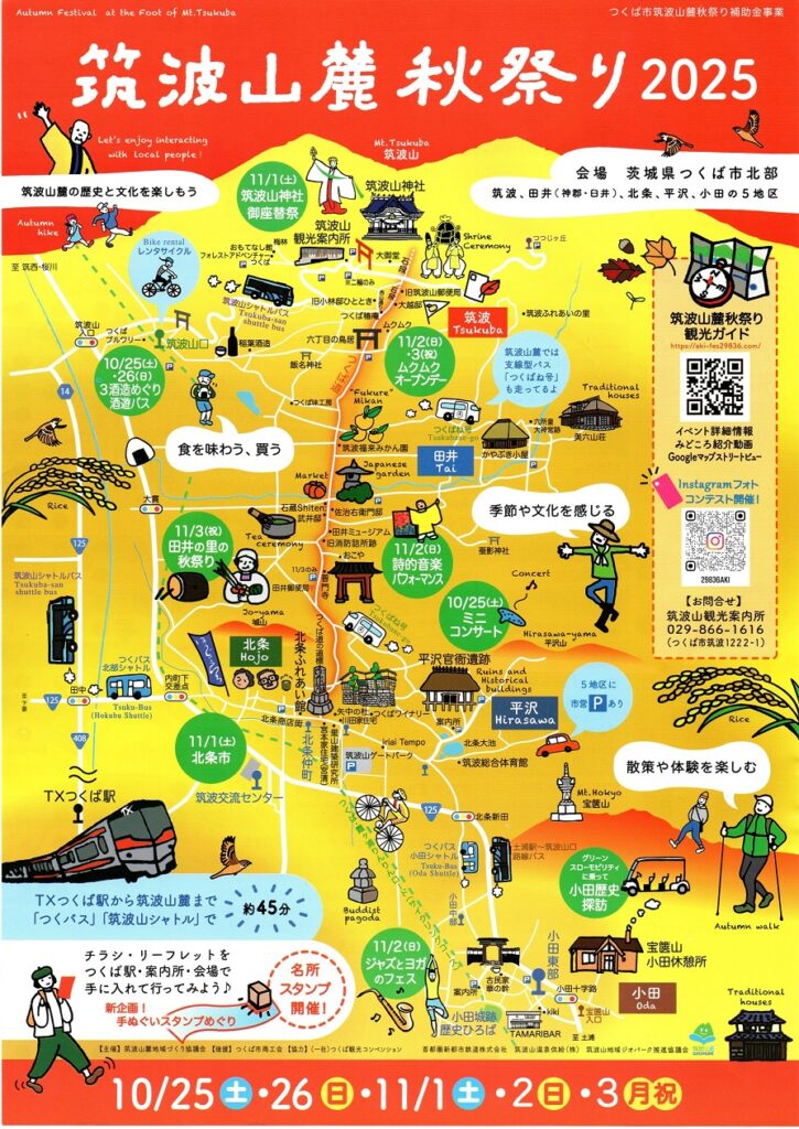 10月25日(土)・26日(日)・11月1日(土)・2日(日)・3日(月祝)に開催。会場は筑波山南麓。およそ40もの各種イベントが次の5地区で開催されます。 「筑波、田井(神郡・臼井)、北条、平沢、小田 」皆様のご来場を心よりお待ちしております。くわしくは筑波山麓秋祭りhttps://aki-fes29836.com